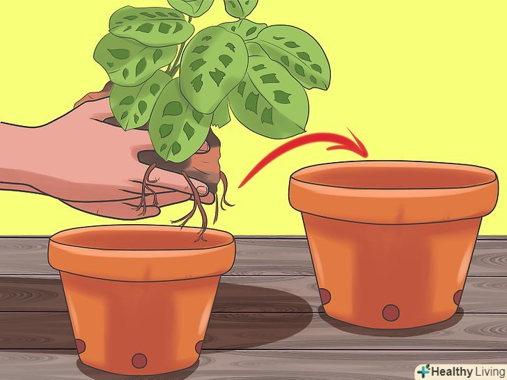 Пересаджуйте маранту тільки навесні або в літній період, якщо використовуваний горщик став вже тісний для рослини. коли горщик переповнюється корінням, грунт висихає дуже швидко і зростання рослини сповільнюється.- Новий горщик повинен бути всього лише на 2,5–5 сантиметрів ширше старого. Покладіть 2,5 сантиметра почвосмеси на дно нового горщика, обережно витягніть маранту зі старого, перенесіть її в новий горщик і заповніть порожнечі почвосмесью. Після пересадки рясно полийте водою, щоб грунт осів навколо коренів.