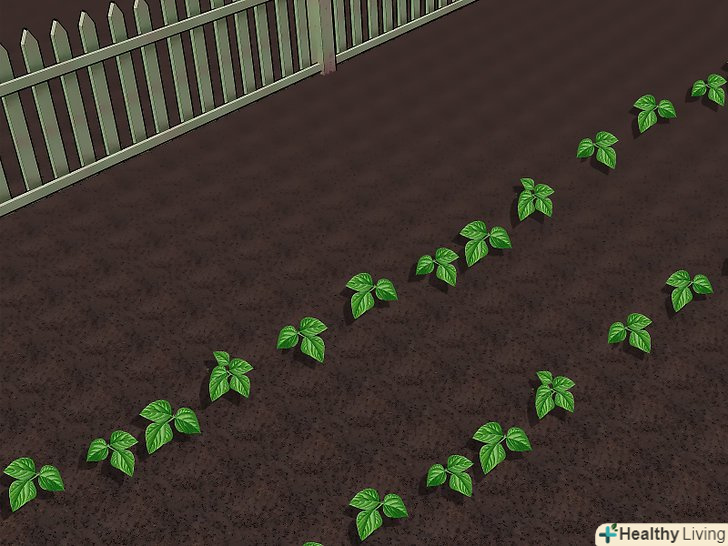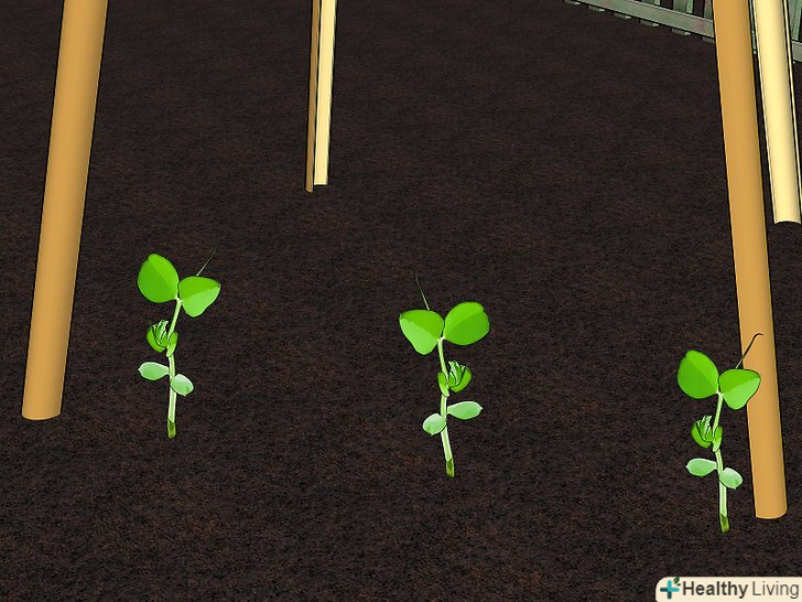 Зробіть опору. більшість сортів гороху і квасолі - плетуться рослини. Тому для них потрібно щось, на що можна плестися: паркан, сітка, натягнута між двома палицями, окремі палиці для кожної рослини або вігвам (зроблений з 3-4 бамбукових жердин, пов'язаних разом на вершині). Коли садите насіння, то краще, щоб вже була готова опора. Опори також можуть допомогти позначити місця насіння.- Якщо хочете виростити горох або квасолю уздовж сітчастого паркану — особливо, якщо він знаходиться на кордоні з сусідом - переконайтеся, що не проти втратити урожай, який буде на іншій стороні паркану. Якщо паркан закриває сонячне світло, то краще не використовуйте його в якості опори; рослини ростуть в сторону сонячного світла і можуть принести трохи врожаю на вашому боці.