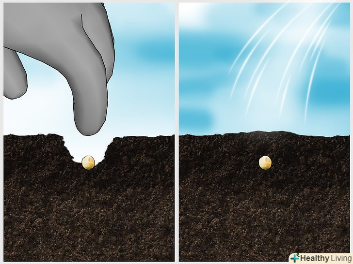 Посійте насіння. Зробіть в грунті пальцем ямку глибиною від 2.5 до 5 см., потім покладіть в ямку насіння. Засипте зверху грунтом і трохи притисніть (щоб забезпечити контакт з грунтом, який має вирішальне значення для проростання) і злегка полийте (поливайте обережно, щоб уникнути відкриття насіння). Наприклад, налийте воду в руки і розбризкуйте її над місцем посадки кожного з насіння.- Хоча час посадки залежить від сорту, але квасоля, як правило, садять навесні за один-два тижні до останнього сильного морозу. Слідкуйте за температурою грунту; сигналом для посадки буде температура 16 ºС. Майте на увазі, що кольорові насіння, швидше за все, проростуть у холодній грунті, ніж білі насіння [8] .