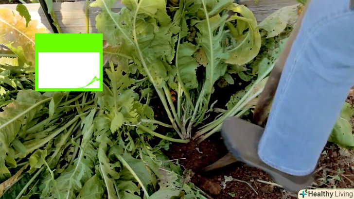 - Розпушіть грунт і витягніть рослину з землі. з допомогу лопати або садового совка акуратно розпушите грунт навколо надземної розетки листя рослини. Коли кореневище здасться з землі, захопіть його підставу руками і тягніть, поки не витягнете з грунту всю кореневу систему рослини. Кореневище дорослого хрону досягає в довжину 15-25 сантиметрів, так що копайте глибше, щоб уникнути пошкодження коренів. [13] [14]