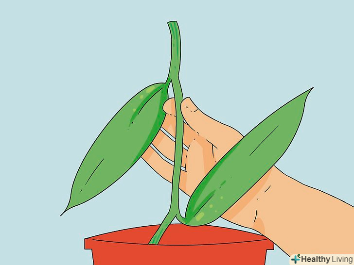 Посадіть в горщик держак ванілі. занурте підстави двох нижніх листків в грунт на 2-3 сантиметри. Злегка утрамбуйте землю руками, щоб закріпити держак. [8]