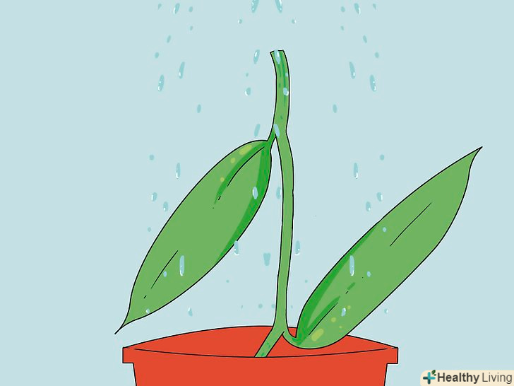 Поливайте рослину, коли земля в горщику висохне, або щодня обприскуйте його водою. перш ніж полити ваніль в черговий раз, дочекайтеся, поки висохне верхній шар грунту глибиною 5-8 сантиметрів. Після поливу земля повинна бути вологою, але не мокрою. Можна також щодня обприскувати рослину дистильованою водою з пульверизатора. Злегка бризкайте водою на грунт, стебло і листя ванілі. [12]