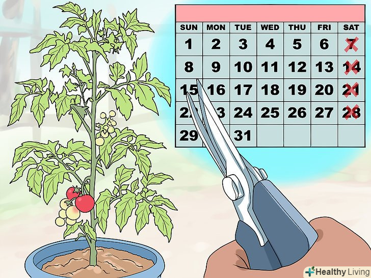 Обрізайте рослини раз на тиждень. обрізка помідорів є безперервним процесом. Оскільки рослина продовжує рости, вам потрібно спрямувати це зростання на збільшення кількості помідорів. Слідкуйте за рослиною, видаляючи небажані пагони приблизно раз на тиждень. [6]- Занадто часта обрізка може привести до смерті рослини.
