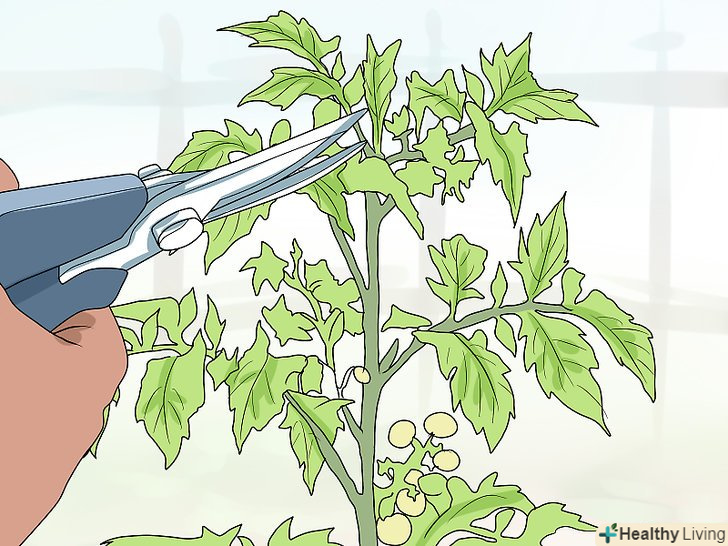 Подумайте про обрізку основних пагонів. помідори зазвичай ростуть вгору, а не в ширину. Якщо рослина стало занадто високим, подумайте про обрізку самих верхніх пагонів помідора. Будучи обмеженим в зростанні вгору, рослина направить всі свої сили на розвиток плодів. [12] [13]- Обрізка верхньої частини рослини зупинить його подальше зростання вгору. Але робити це можна лише в самому кінці вегетаційного періоду, до перших заморозків.