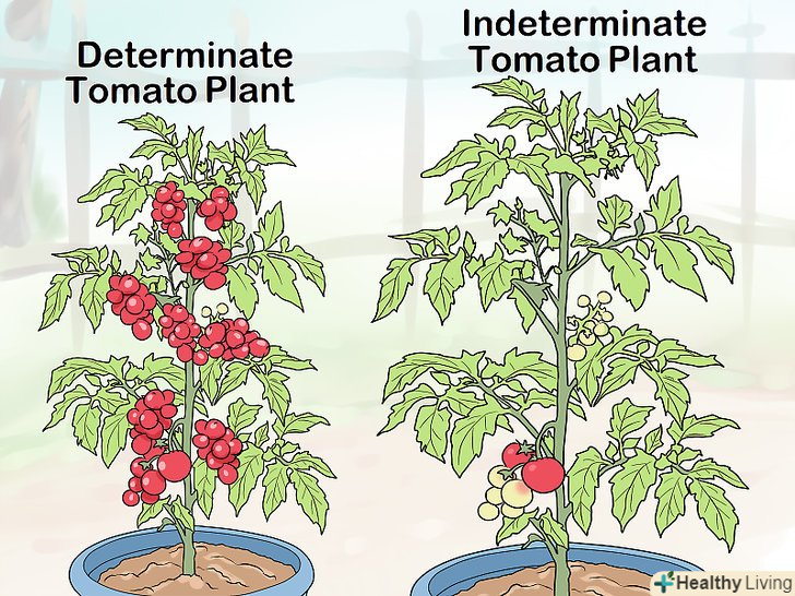 Дізнайтеся про два основних різновиди помідорів. якщо ви збираєтеся вирощувати помідори у внутрішньому дворі, вам потрібно переконатися, що вони є саме тим різновидом, яка вам потрібна. Є дві основні різновиди помідорів: детермінантні і індетермінантні. Детермінантні помідори виростають в невеликий кущ і, як правило, добре підходять для вирощування в горщику. Індетермінантні помідори виростають крупніше, ніж детермінантні, але вирощувати їх в горщику набагато складніше. [14]- Детермінантні помідори більше підходять для вирощування у внутрішньому дворі.