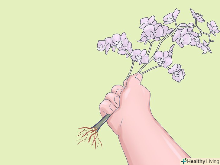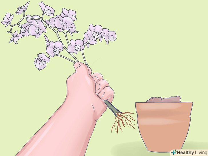 Акуратно вийміть міні-орхідею з її горщика. обережно візьміться однією рукою за основу орхідеї, а іншою рукою в цей час тримайте горщик. Покладіть горщик набік або переверніть його догори ногами, і повільно стискайте або обертайте сторони горщика, поки клубок коренів не відокремиться від його стін.