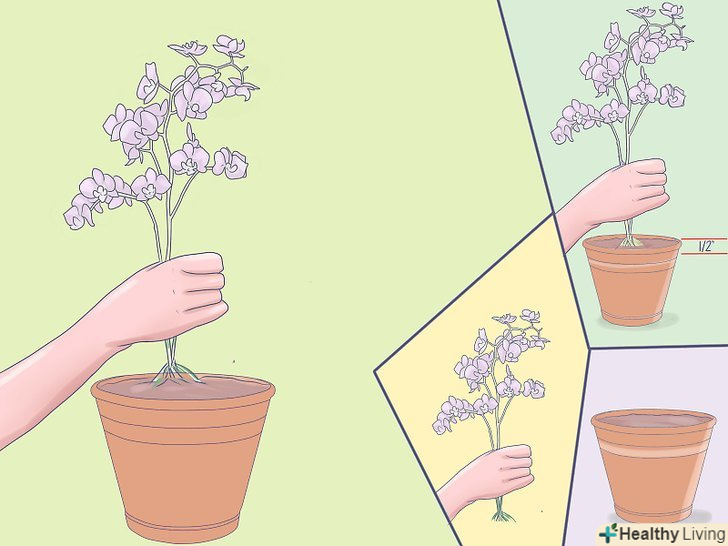 Помістіть міні-орхідею в новий контейнер. встановіть її так, щоб основа самого нижнього листа опустилося нижче краю горщика на 1/2 дюйма (1.27 сантиметра).