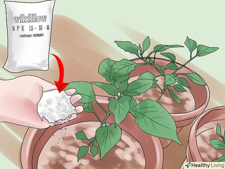 Заохочуйте зростання, даючи рослинам добриво для овочів щомісяця. використовуйте збалансоване 15-15-15 добриво, що містить азот, фосфор і калій.- Три цифри на пакеті добрива відносяться до процентного вмісту азоту, фосфору і калію, що містить добриво. 15-15-15 добриво має рівні частини всіх трьох елементів, що означає, що листя, коренева система, квіти, і плоди перцю набрали рівну дозу підгодівлі. Азот покращує листя, калій покращує цвітіння і загальну міцність рослини, а фосфор покращує коріння і плоди.