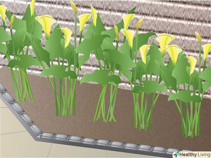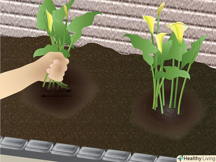 Пересадіть рослини або бульби в землю, як тільки немає загрози заморозків.- Посадіть рослини на відстані не менше 30 см. один від одного. Деякі кали виростають до 1.2 м.з листям розміром 30 см. і більше.