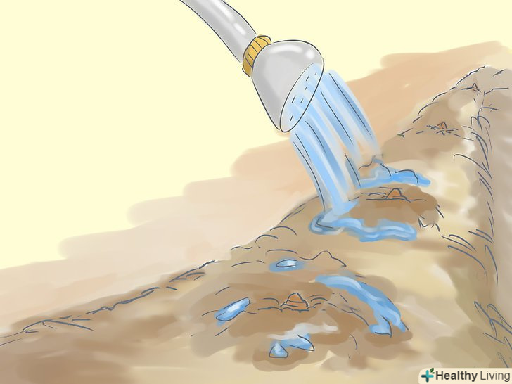 Полийте бульби після посадки. після посадки гарненько пролийте бульби водою. Після початкового поливу грунт слід підтримувати у вологому, але не розкислому від води стані.