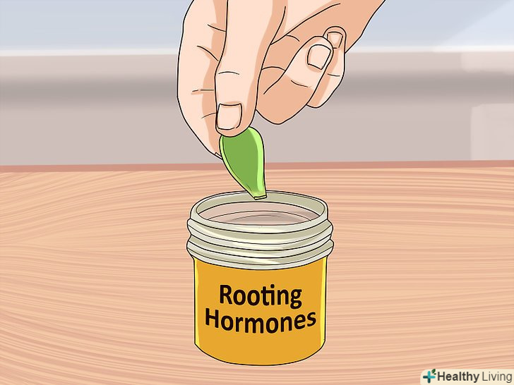 Занурте підсушені листя в стимулятор коренеутворення. налийте в невелику миску трохи стимулятора коренеутворення. Протріть підсохле місце зламу листа вологим рушником, щоб злегка змочити його. Занурте зволожений кінець листа в стимулятор коренеутворення. Зробіть невелике поглиблення в землі для посадки і негайно застроміть туди лист. Пальцями утрамбуйте грунт навколо обробленого стимулятором кінця листа.- Застосовувати стимулятор коренеутворення для вирощування сукулентів з листя не обов'язково, але з ним термін появи коренів скорочується і збільшуються шанси на успішне розведення рослини. [5]