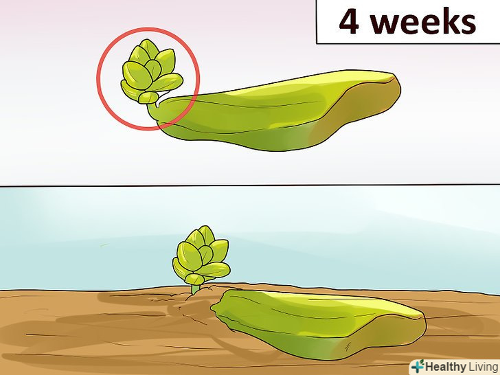 Присипте з'явилися коріння грунтом. через чотири тижні з листя на місці зламу почнуть рости невеликі рожеві корінці. Присипте ці корінці тонким шаром грунту, щоб вони не пересохли. [9]- Після того як коріння опиняться в землі, вони продовжать рости, щоб утворити нову рослину. Коли почне формуватися нова рослина і у нього з'являться свої власні листя, його можна буде пересадити в індивідуальний горщик.
