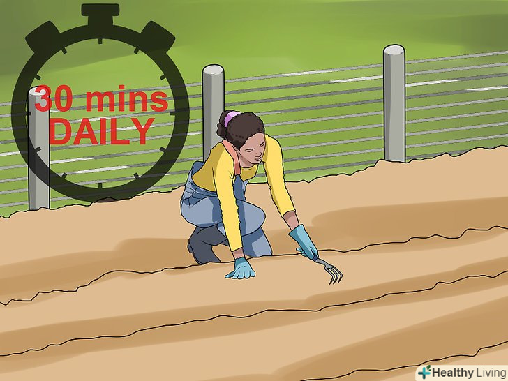Регулярно працюйте в саду. Якщо ви хочете зміцнити загальний стан здоров'я, то працювати в саду слід регулярно. Працюйте кілька годин на тиждень, наприклад, 30 хвилин щодня, щоб отримувати необхідне фізичне навантаження. [3]- 30 хвилин помірного фізичного навантаження кожен день дозволяють знизити кров'яний тиск і рівень холестерину, допомагають запобігти розвитку діабету і хвороб серця, уповільнюють розвиток остеопорозу.