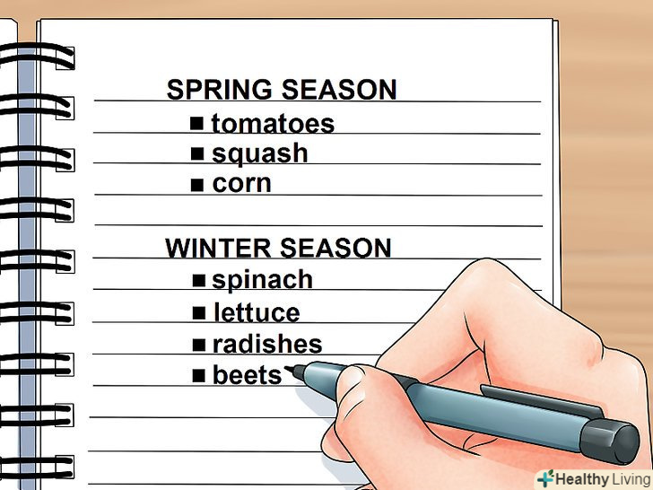 Вирощуйте різні рослини. коли будете планувати, що посадити, вибирайте різноманітні рослини, які корисні для здоров'я і допоможуть розширити раціон. Різні овочі та фрукти стануть запорукою здорового харчування протягом року.- Орієнтуйтеся на свій клімат і віддайте перевагу тим овочам, які досить просто вирощувати: помідори, салат-латук, горох, квасоля, гарбузи і огірки. [8] якщо ви новачок, то спочатку виберіть кілька видів простих рослин.