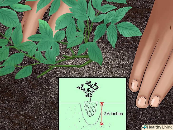Якщо ви живете в холодному кліматі, розмістіть кореневу шийку нижче лінії грунту. якщо у вашій місцевості бувають холодні зими, помістіть кущ в ямку так, щоб коренева шийка (опуклий ділянку, де з'єднуються корінь і стовбур) розташовувалася на 5-15 сантиметрів нижче рівня грунту. Засипте ямку землею. Тим самим ви захистите рослину від морозів. [11]