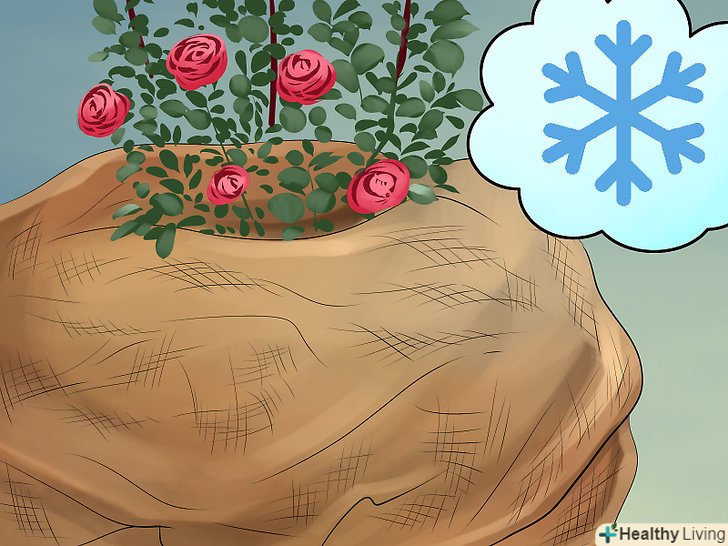 На зиму накрийте опору з трояндою мішковиною. у холодні зимові місяці слід захистити троянди від заморозків, інакше вони можуть загинути. Щоб рослини благополучно пережили зиму і залишилися здоровими, присипте їх соломою і накрийте зверху мішковиною. [15]