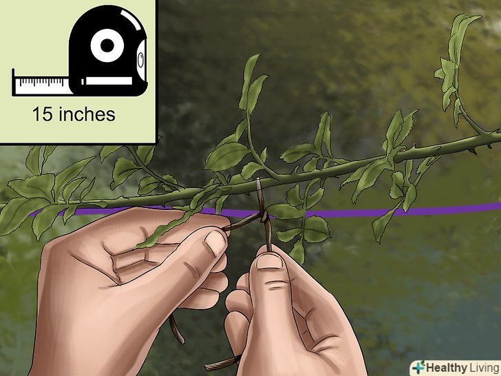 Привчіть лози рости горизонтально протягом другого року. після того як пройде хоча б один рік після посадки і рожевий кущ закріпиться і почне рости уздовж опори, Виберіть 4 або 5 найбільш здорових і міцних лоз. Виріжте з колготок смужки довжиною 20-30 сантиметрів і вільно підв'яжіть ці здорові лози до опори, але на цей раз постарайтеся направити їх горизонтально.- У міру зростання лоз продовжуйте горизонтально прив'язувати їх до опори через рівні інтервали довжини.