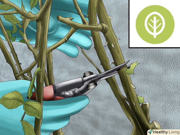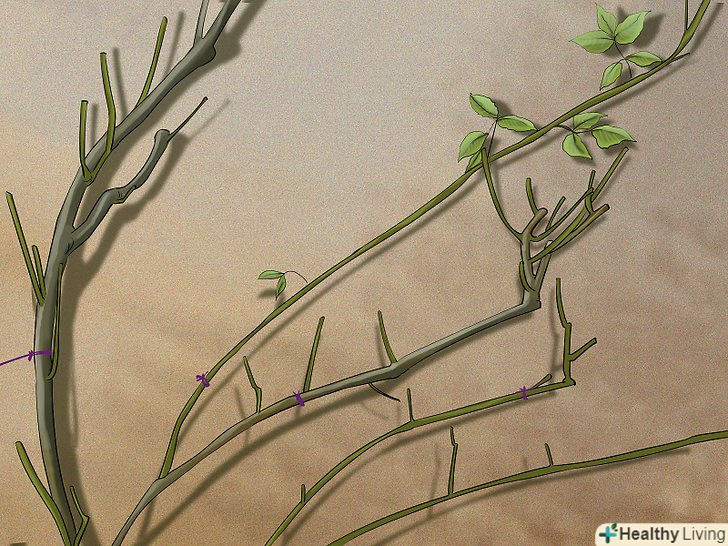 Підрізайте троянди щовесни. коли рожевому кущу виповниться близько трьох років, необхідно почати зрізати старі лози, щоб сприяти подальшому зростанню. Для цього розріжте петлі на найстаріших, сірих і задерев'янілих лозах і зріжте їх біля основи. Таким чином ви звільните місце для зростання нових лоз. [4]- Можливо, вам доведеться не тільки видаляти мертві, пошкоджені і хворі лози, але і обрізати пересічні лози, а також пагони нижче кореневої шийки. [5]