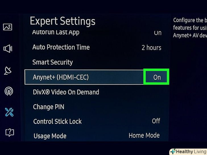 Знайдіть Налаштування технології HDMI-CEC. Назва потрібної опції залежить від моделі телевізора — вона може перебувати в розділі «Параметри вхідного сигналу», «параметри системи» або в аналогічному. Більш того, у кожного виробника телевізорів свою назву технології HDMI-CEC. Далі наведено список виробників телевізорів і їх назви технології HDMI-CEC. [3]- AOC: E-link
