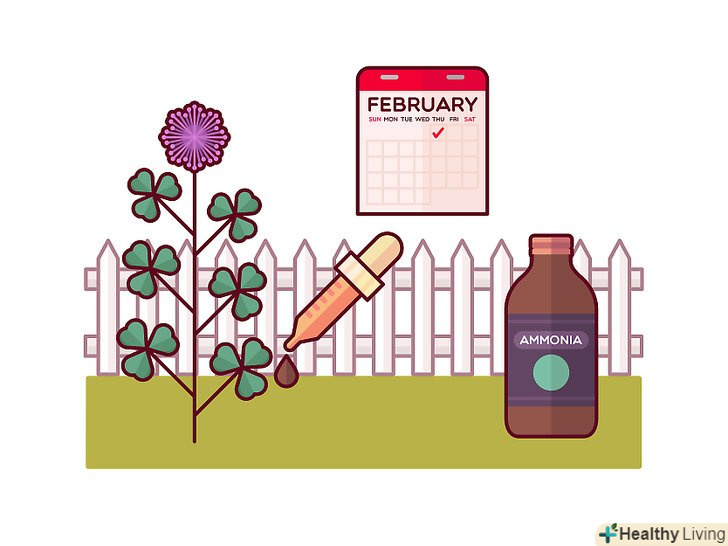 Обробіть конюшину аміаком, щоб спалити його. аміак спалить і вб'є конюшину. Купуйте тільки сульфат аміаку, який спеціально призначений для газонів, і використовуйте його після дощового дня, коли земля буде все ще мокрою. Якщо не хочете чекати дощу, обприскати газон зі шланга. Нанесіть аміак прямо на конюшину, щоб не обпалити інші ділянки газону. [3]- Наносите аміак раз на місяць або поки конюшина не зів'яне.