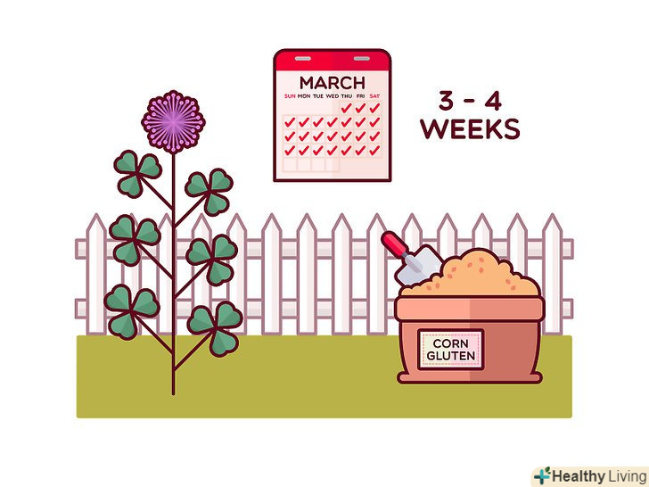 Обробіть конюшину кукурудзяним глютеном. кукурудзяний глютен — це натуральний гербіцид, за допомогою якого можна позбутися від конюшини. Знайдіть кукурудзяний глютен у вигляді порошку, який можна посипати на конюшину. На 93 м 2 газону вам знадобиться 9,1 кг кукурудзяного глютену. [5]- Розсипаний кукурудзяний глютен необхідно буде змочити водою і залишити висихати на 2-3 дні, щоб він міг вбити конюшину.