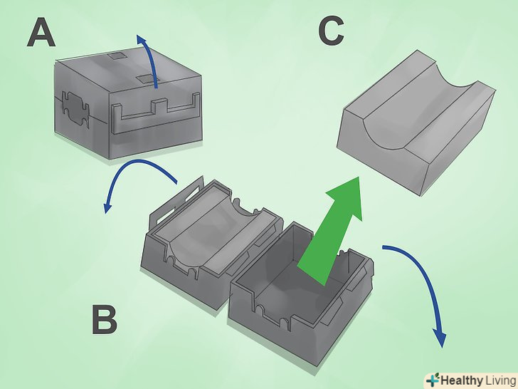 Відкрийте фільтр і дістаньте одну з частин феритового сердечника.Ваш феритовий фільтр-засувка повинен складатися з зовнішнього корпусу і магнітних сердечників, виконаних зі сплаву оксиду заліза та інших металів. Сердечники, як правило, темного кольору і часто використовуються в електричних трансформаторах і індуктивних котушках, де компоненти, такі як провід соленоїда, намотані навколо внутрішнього сердечника.- Феритові фільтри-засувки зазвичай мають циліндричну форму з круглим отвором по центру для шнура. Їх можна відкрити з боку, протилежної тій, де знаходяться петлі.