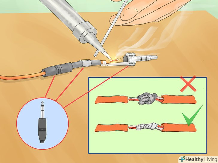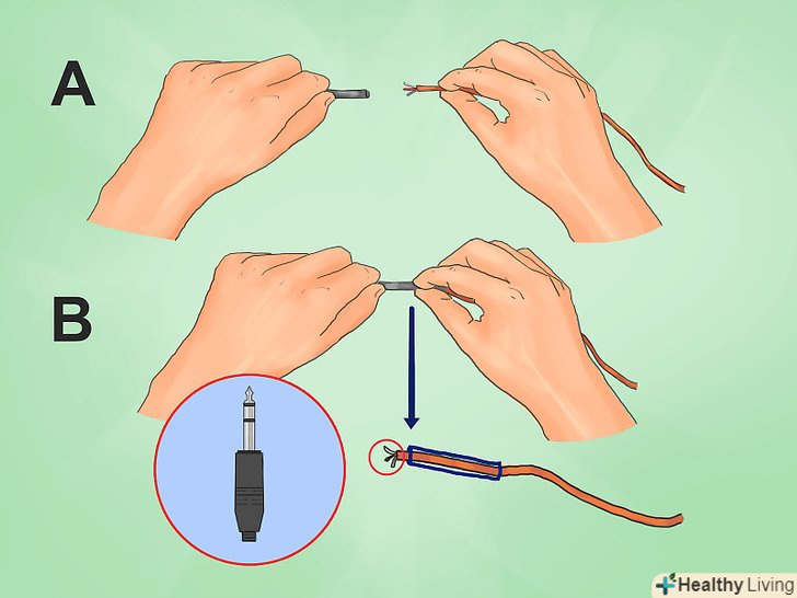 Припаяйте два кінці намотаного дроту 6.35 мм до штекера jack.ви повинні припаяти кінці проводів до контактів штекера jack. Чи не перегрівайте провід, інакше він стане крихким і може переломитися.- Найкраще спаюються попередньо зачищені і протерті технічним спиртом поверхні.[4]