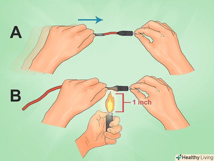 Розташуйте вашу термоусадочну трубку над місцем пайки.[5] Обложіть її за допомогою джерела тепла. Таким чином термоусадочна трубка туго охопить місце пайки.- При використанні запальнички тримайте полум'я на відстані 3 - 4см. від термоусадки.
