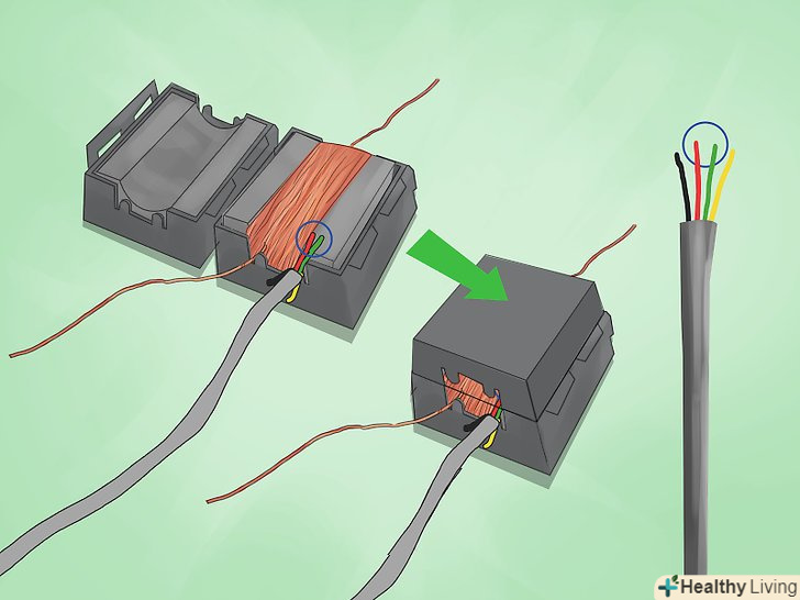 Відкрийте феритовий фільтр і помістіть червоний або зелений дріт всередину нього.Одного з цієї пари проводів телефонної лінії буде достатньо. Не використовуйте жовтий провід, інакше ваша прослушка не буде приймати сигнал.[6]