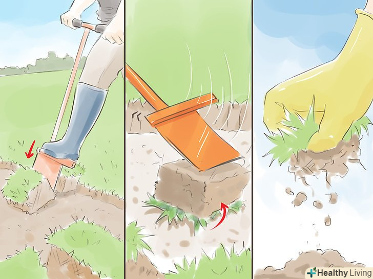Викопайте дерен: розріжте на шматки. Переверніть, розпушіть грунт плоскою частиною лопати. Не видаляйте коріння по краях, так як це створить кореневі живці, які будуть рости, якщо залишити в квітнику. Витрусіть грунт в квітник. Перемішайте дерен в компості, де він може розкладатися, якщо ви захочете.
