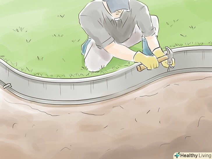 Якщо бажаний край хвилястий, можливо, доведеться обрамлення газону тримати по кривій. вони встановлюються горизонтально, біля основи обрамлення забиваючи через нього, трохи вище арматурної смуги в грунт під газон. Вони * не * розташовуються вертикально.