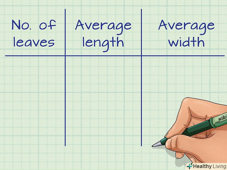 Побудуйте таблицю. Число рядків в таблиці має відповідати кількості вимірювань. Позначте стовпці як "кількість листя", "середня довжина"і" середня ширина". В даному методі слід вимірювати листя кожні 2-3 дні.