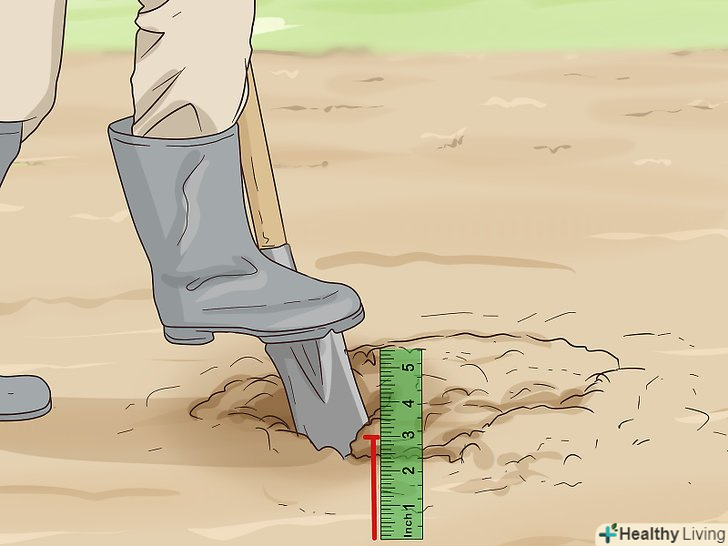 Виройте ямку на 8 сантиметрів глибше і ширше, ніж клубок коренів. додаткове місце необхідно для того, щоб коріння краще закріпилися в грунті. Присипте коріння вийнятої з ямки землею, так щоб вона була на одному рівні з навколишнім грунтом. [21]- При посадці саджанців немає необхідності додавати добрива, хоча при бажанні можна підмішати в землю сфагнум або компост. [22]