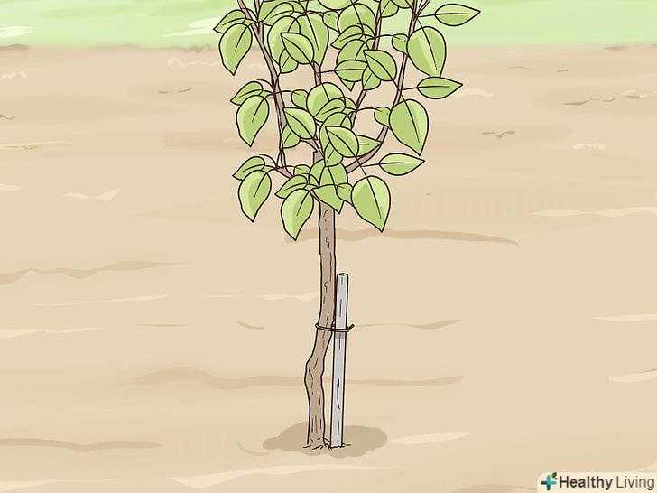 Прив'яжіть стовбур до кілочка. щоб дерево росло прямо, прив'яжіть стовбур саджанця до дерев'яного кілочка. Можна використовувати два кілочка і обв'язати стовбур мотузкою у формі цифри 8. [23]