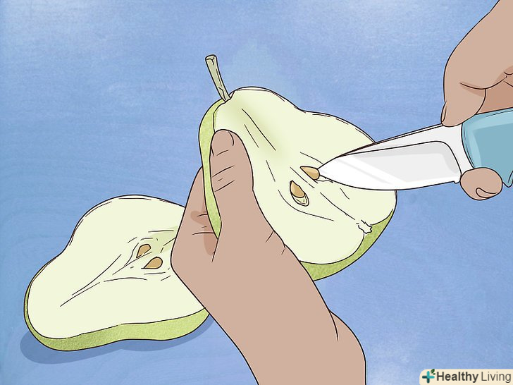 Виріжте з груші насіння. добре підійде звичайна покупна груша. Візьміть гострий ніж і розріжте грушу навпіл. Розріжте половинки ще раз-в результаті у вас вийде чотири скибочки, і ви легко зможете дістатися до серцевини з насінням. Дістаньте насіння ложкою або пальцями. В одній груші має бути близько 8 насіння. [2]- Завдяки перехресному запиленню кожна груша унікальна. Якщо ви збираєтеся посадити в майбутньому більше дерев, які дадуть такі ж плоди, можна покласти половину насіння в пластиковий пакет і зберігати їх в холодильнику 2 роки.