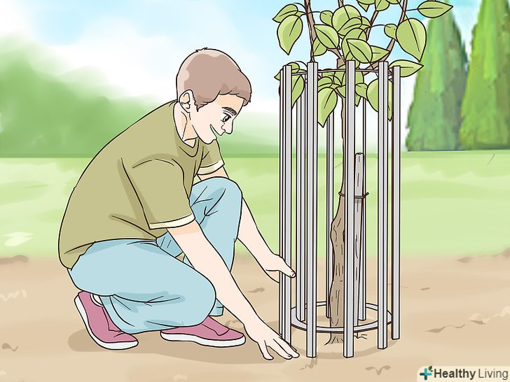 Встановіть огорожу навколо основи дерева. дрібні ссавці люблять обгризати кору зі стовбура, тому захистіть дерево невеликою огорожею. Огорожу для дерев можна придбати в магазині товарів для саду та городу. [24] коли кора затвердіє і покриється лусочками, огорожу можна буде прибрати. [25]- Крім іншого, огорожа захистить стовбур від прямих сонячних променів.