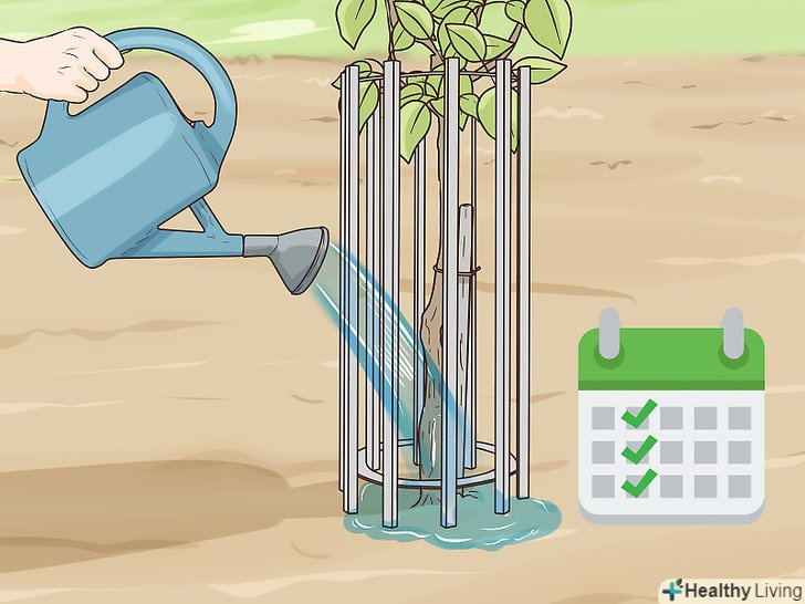 Протягом першого року поливайте дерево раз на тиждень. спочатку коріння не зможуть добувати з землі необхідну кількість води. Поливайте дерево несильним струменем з лійки в ранковий або вечірній час, коли на нього не падає пряме сонячне світло. Згодом коріння зможуть добувати з землі достатньо вологи. [26]- Перевіряйте грунт навколо дерева. Якщо вона волога на дотик, не слід поливати грушу. Надмірна кількість води шкідливо для дерева.