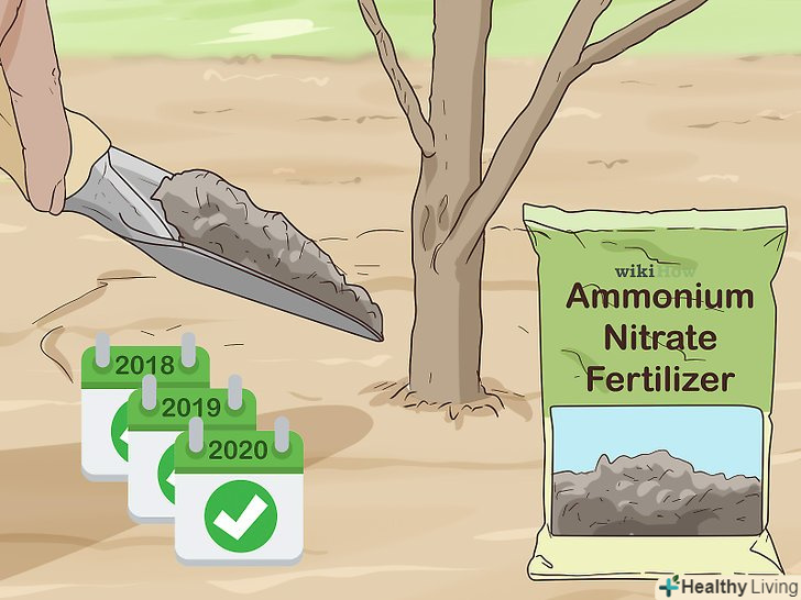 Раз на рік удобрюйте дерево. робіть це ранньою весною і використовуйте добриво з нітратом амонію. Щоб визначити необхідну кількість добрива, помножте 60 грамів на вік дерева. Ця кількість може змінюватися в залежності від того, наскільки родючий грунт. [27]- Якщо влітку листя стає блідо-зеленими або жовтими, використовуйте більше добрива на наступний рік.