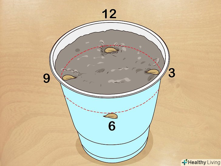 Наповніть пластиковий стакан грунтом для кімнатних рослин і посадіть насіння на глибину близько 1,5 сантиметра. висаджуйте насіння на однаковій відстані один від одного. Якщо ви хочете посадити 4 насіння, уявіть, що склянка являє собою циферблат годинника, і розмістіть насіння в положенні 3, 6, 9 і 12 годин. [9]- Застроміть біля кожного насіння зубочистку, щоб знати, де вони знаходяться.