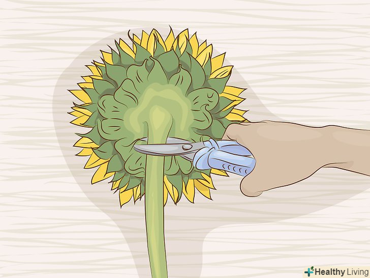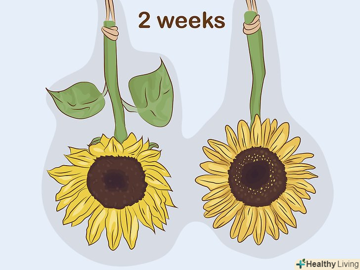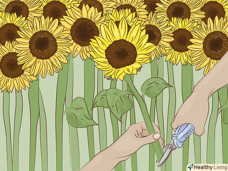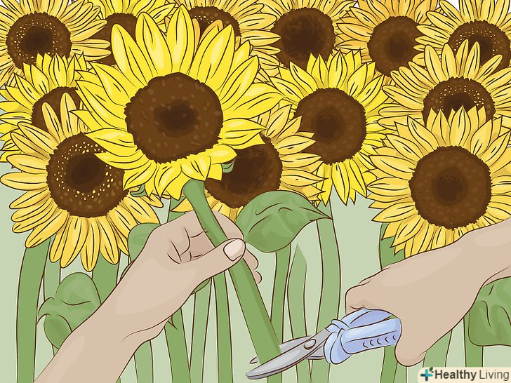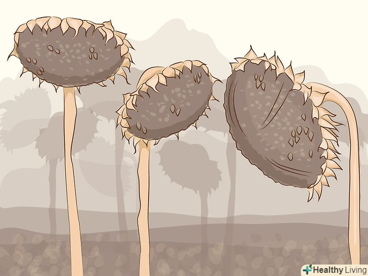 Зачекайте, поки Соняшники дозріють на грунті. при теплій і сухій погоді необхідно дочекатися, поки Соняшники повністю дозріють в землі. По можливості не зрізайте Квіти до тих пір, поки вони не змінять чорний колір на жовто-коричневий. [14]- Найкраще дочекатися, коли Соняшники почнуть втрачати пелюстки, а їх головки повиснуть. Може знадобитися підв'язати головки квітів до жердин, інакше вони повиснуть і відімруть. Головки отяжелеют, і рослини стануть згинатися під власною вагою.