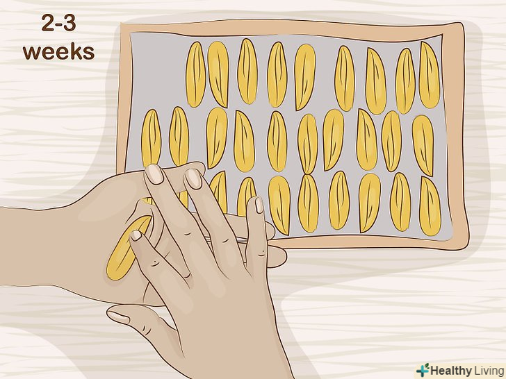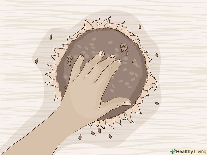 Через кілька тижнів зберіть насіння. коли квіти повністю висохнуть, ви зможете просто витягти насіння пальцями або жорсткою щіткою. Можна також використовувати вилку. [16]- Якщо у вас кілька соняшників, можна потерти їх головками один об одного.