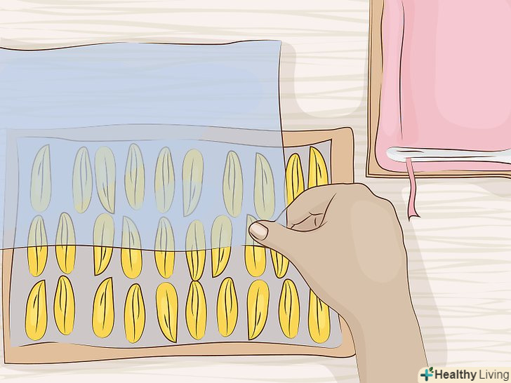 Перевірте пелюстки. через 2-3 тижні акуратно зніміть лист картону і промокальний папір і огляньте пелюстки. Якщо вони все ще вологі, постеліть свіжу промокальний папір і притисніть їх ще приблизно на тиждень, а потім перевірте знову. [20]
