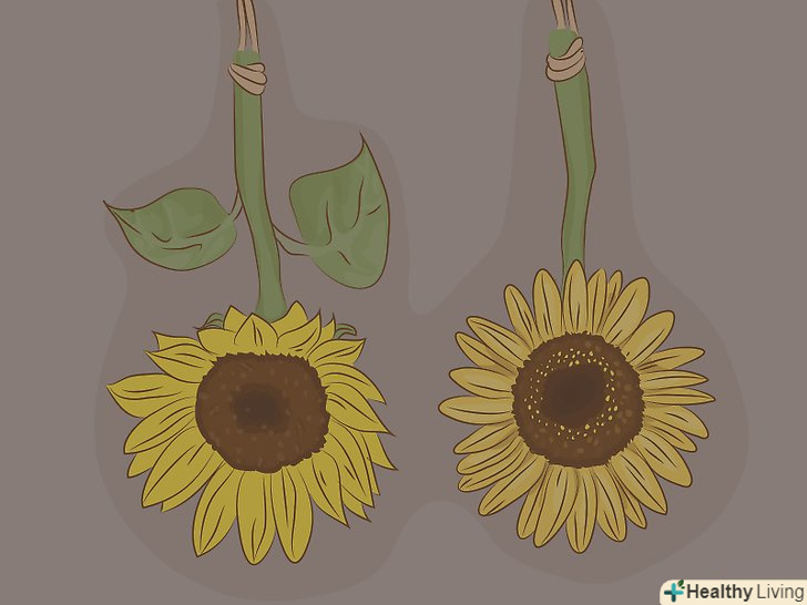 Підвісьте квіти соняшнику в темному сухому місці. Прив'яжіть квіти за стебла до нитки пряжі або мотузці. Можна розмістити по три квітки, але при цьому стежте, щоб їх головки не торкалися один одного. Розвісьте зібрані квіти в темному сухому місці, наприклад в порожній коморі, коморі або на горищі. [3]- Можна також сушити Соняшники у вазі. При цьому їх пелюстки красиво вигнуться. Просто поставте вазу з квітами в темному сухому місці. [4]