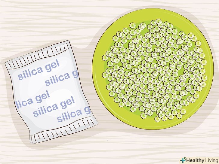 Спробуйте використовувати силікагель. ще один спосіб полягає в тому, щоб просто застосувати силікагель. Силікагель міститься в пакетиках з відповідним написом і попередженням " Неїстівно "("Do not eat"), які кладуть в коробки з взуттям, шкіряними виробами і іноді з їжею. Його можна також придбати через Інтернет або в магазині товарів для рукоділля. Силікагель висушує різні предмети швидше, ніж інші речовини, тому немає необхідності додавати до нього сіль для збереження кольору. [11]