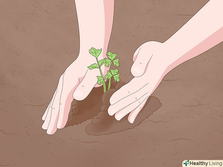 Помістіть розсаду в ямку і засипте. засинайте тільки до першого рівня листя і, для підтримки, злегка притисніть руками грунт навколо саджанця.
