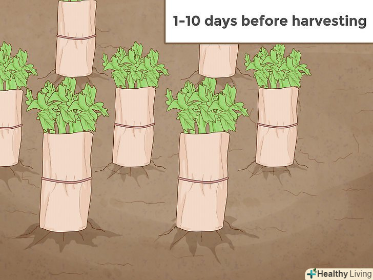 Перш ніж зібрати селера, захищайте його від сонця 7 - 10 днів. Захистіть стебла селери від сонця для досягнення більш м'якого смаку. Покрийте стебла газетою, пакетом з-під молока, видаливши дно і верх, або іншими видами паперу або картону. Також можна використовувати шпагат, щоб зв'язати стебла і запобігти їх "розлогість".- Хоча захист від сонця не обов'язкова, але вона змінить смак і колір селери. Крім того, селера, що росте на сонці, менш поживна, ніж звичайна. Більшість людей вважають за краще солодкий смак захищеного від сонця селери.