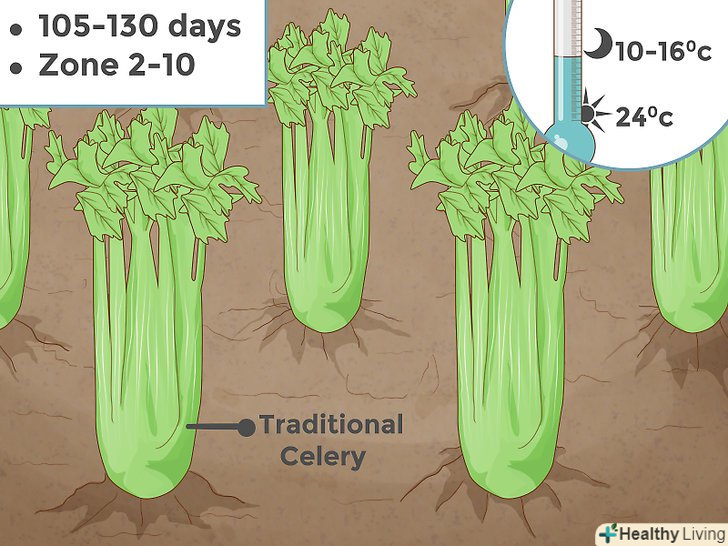 Традиційний селера (Apium Graveolens сорт Dulce). традиційній селері потрібен довгий, помірний вегетаційний період і йому потрібно 105-130 днів, щоб повністю дозріти.- Цьому селері не подобаються екстремальні температури. Найкраще він росте при температурі до 24 °С в денний час, і при температурі 10 -15 °С в нічний час.