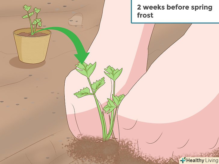 Пересадіть саджанці у відкритий грунт за два тижні до останнього весняного морозу. переконайтеся, що на вулиці не надто холодно. Селера може впоратися з легким морозом, але температура нижче 13 °С протягом дня і 4 °С в нічний час, яка тримається більш, ніж один тиждень, може завдати шкоди рослині.