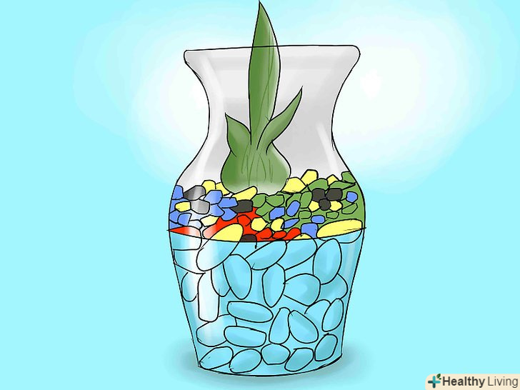 Як альтернативу спробуйте метод із заповненою камінням вазою. можете заповнити високу вазу декількома жменями декоративної гальки або скляними кульками, потім налити у вазу води.- Цибулина повинна лежати на каменях, але не торкатися поверхні води.