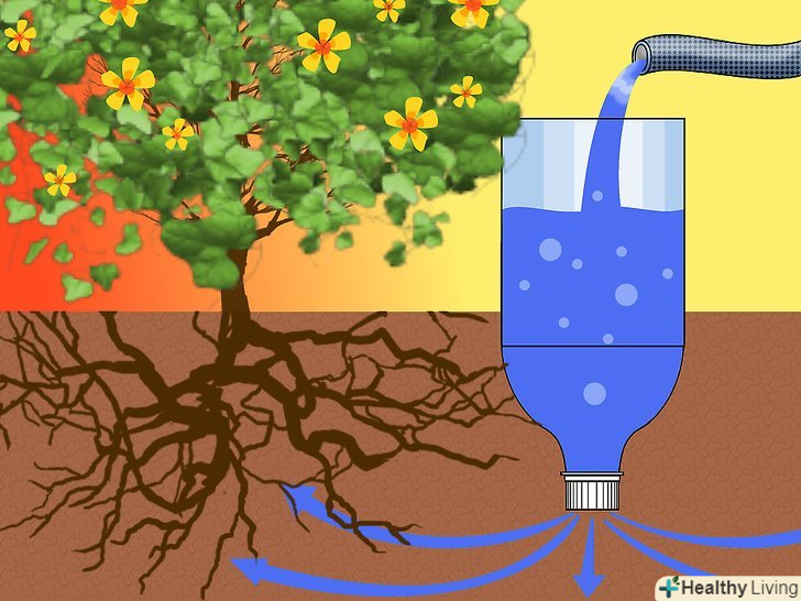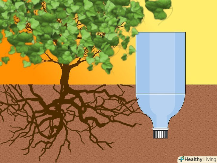 Викопайте яму близько одного або декількох рослин настільки глибоко, щоб було зарито від третини до половини пляшки. помістіть туди пляшку кришкою вниз. Переконайтеся, що частина пляшки (де ви відрізали дно) залишається над землею і не засипається землею. Закріпіть пляшку на одному місці, прикопуючи її землею навколо. Помістіть кілька каменів або гальку навколо пляшки, щоб запобігти потраплянню грунту в неї.